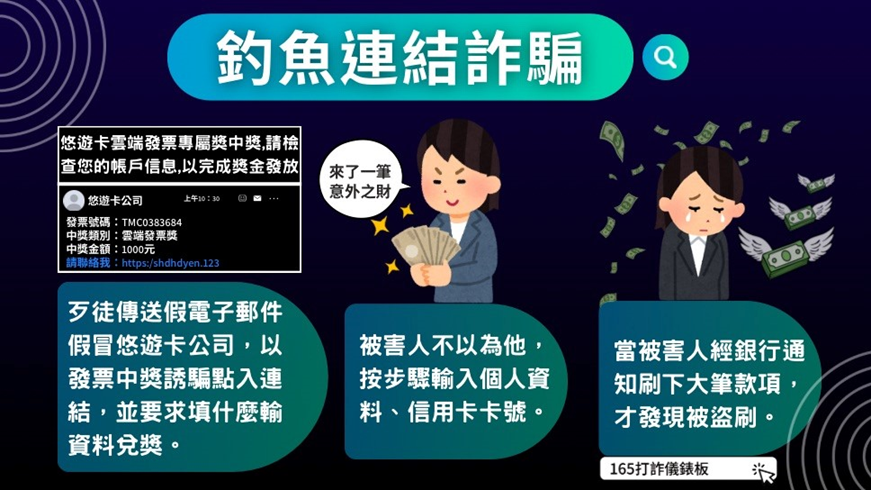 近期出現以「釣魚連結」方式詐騙的案例,例如偽造中獎通知、要求點擊網址並填寫個人資料、信用卡資訊等,一旦資料遭不當蒐集,詐騙集團便可能進行盜刷或其他非法行為,請務必小心,常見的釣魚連結詐騙手法如下: