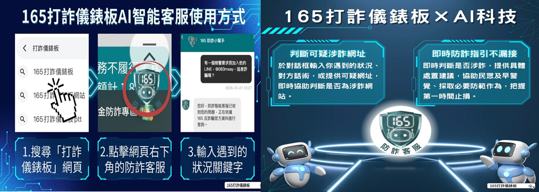 為協助民眾即時辨識詐騙風險,內政部警政署於「165打詐儀錶板」網站新增「防詐客服」AI 智能服務。