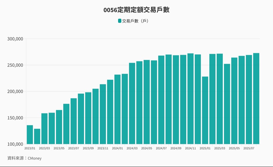 0056的定期定額交易戶數自2023年初以來呈現持續攀升的趨勢,從不到15萬戶一路成長至 2025 年中超過27萬戶,規模穩居市場領先地位。這樣的數據顯示,0056不僅是台灣首檔高股息ETF,也已成為市場上定期定額戶數排名前三大的 ETF之一,代表其在投資人心中具備高度的長期存股吸引力與信任度。