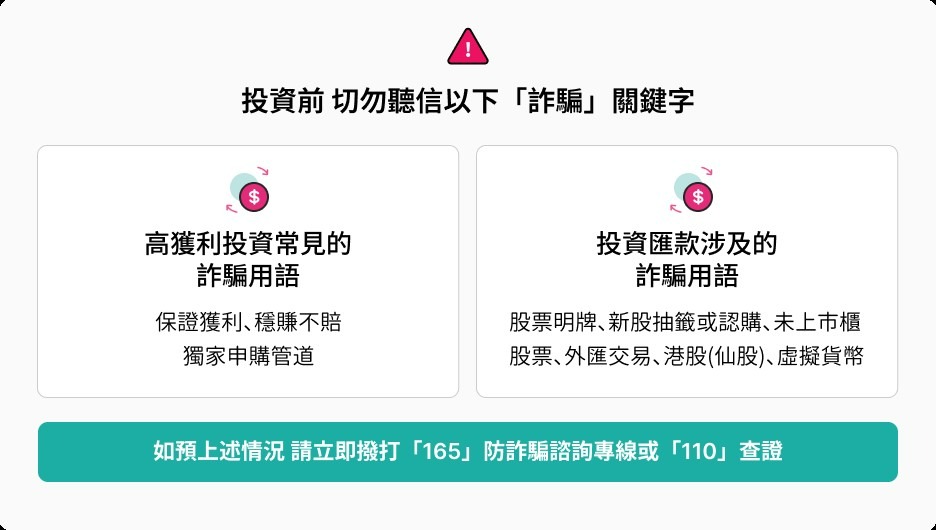 (二) 即使乍聽之下合理的投資方式,也要尋求多方查證,如遇到任何要求投資人匯款,或是涉及「股票明牌、新股抽籤或認購、未上市櫃股票、外匯交易、美股、港股(仙股)、虛擬貨幣」等關鍵字,那麼很大的機率是投資詐騙,最好撥打165防詐騙諮詢專線或110查證。