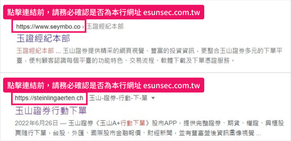 另投資人如接收到以玉山證券名義行銷之任何資訊,也請先檢視以下幾點注意事項,避免落入詐騙陷阱: