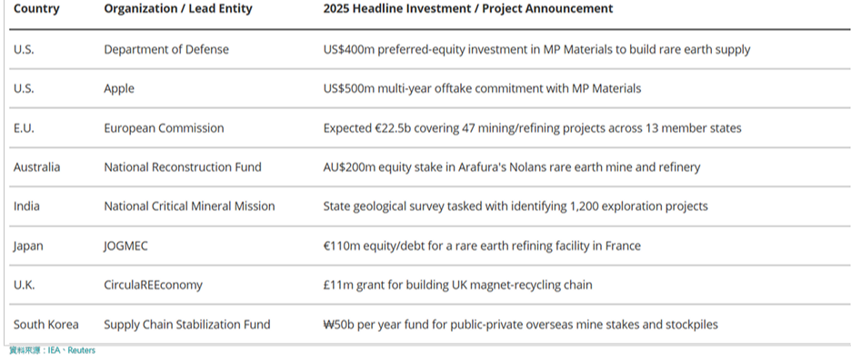 美國政府意識到建立自家稀土供應鏈的重要性與急迫性,近年來正積極應對調整。美國營運商MP Materials已成為指標性專案;該公司獲得數億美元資金,並與國防部與Apple簽署協議,擴大磁體生產與下游加工能力。除了美國之外,其他國家也紛紛動員,在中國以外建立稀土與戰略金屬供應鏈。