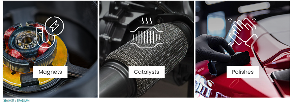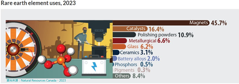 磁體、催化劑與拋光材料,這三大類合計占全球稀土需求超過七成,以下即進一步介紹這些應用: