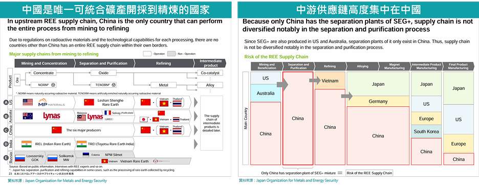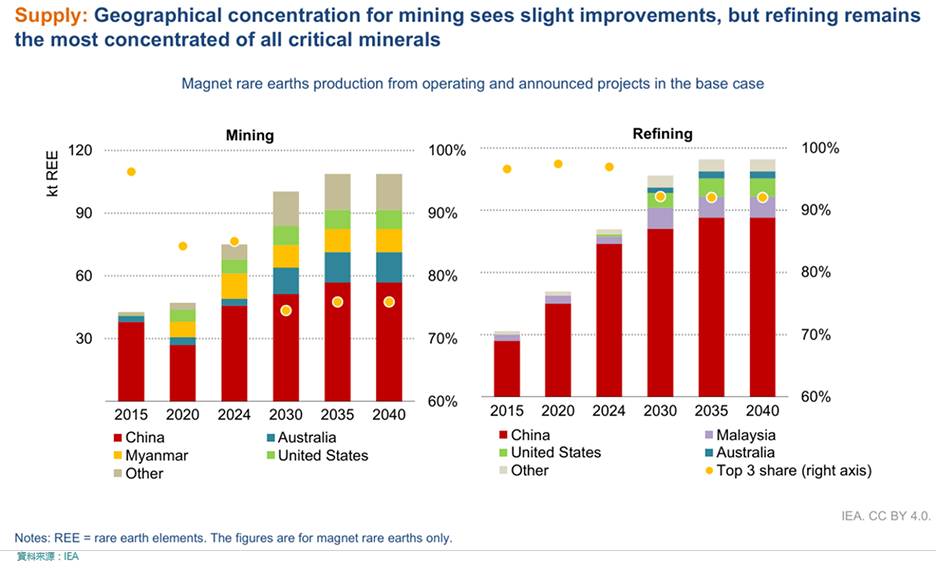 圖:磁體用稀土元素的供給:採礦端產量至2040年穩步上升,來源以中國為首,緬甸、澳洲與美國占比持穩,然精煉端仍高度集中於中國。