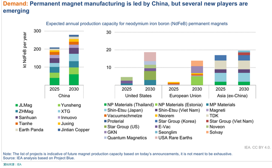 IEA的資料顯示,在電動車馬達與風力渦輪帶動下,至2050年磁體用稀土(Nd、Pr、Dy、Tb)需求將近乎翻倍,使得磁體用稀土礦產以及磁體製造成為稀土產業競爭熱點之一。磁體用稀土在未來雖有多地新增礦產上線,然中國在精煉環節的占比仍大幅領先。另一方面,稀土磁體(以NdFeB磁體為主)製造能力仍以中國為主,但美國、歐盟及亞洲其他國家正陸續擴張,顯示供應版圖從「中國獨強」走向「中國領先、他區追趕」的新態勢。