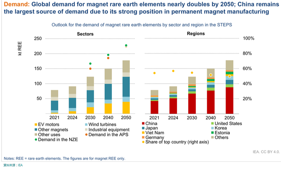 圖:磁體用稀土元素的需求:自2021年起至2050年幾近倍增,而中國由於在磁體製造領域具強勢地位,因此仍是磁體用稀土元素最大需求國。