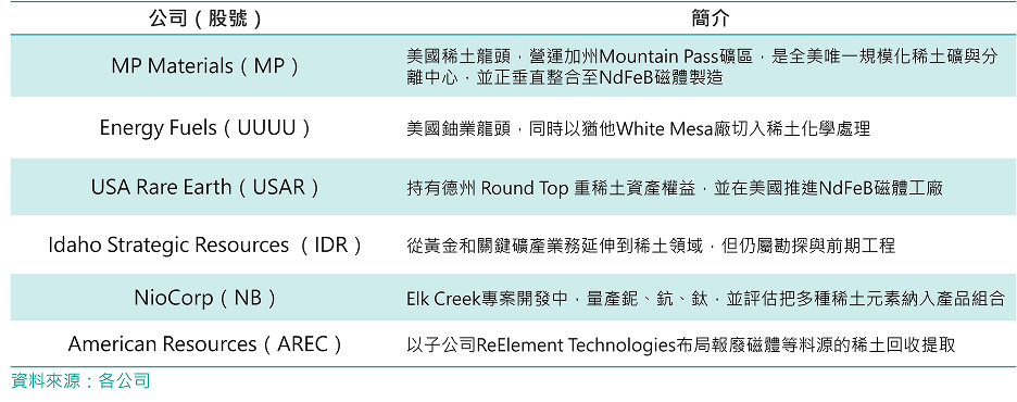 綜觀來看,MP是美國稀土在地化的核心標的,其他公司則分別投入於礦端開發、化學分離、磁體製造、回收再生與關鍵材料等環節,惟布局時宜留意產業位置、量產可見度、長約與資本強度分散布局。
