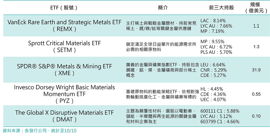 稀土投資也可以透過ETF,以分散單一個股的風險。VanEck Rare Earth and Strategic Metals ETF(REMX)與 Sprott Critical Materials ETF(SETM)都是稀土、關鍵材料純度較高的選擇,持股常見美國第一大稀土供應商MP Materials及澳洲稀土龍頭Lynas,也會納入部分中游加工商;The Global X Disruptive Materials ETF(DMAT)則以新能源與先進製造所需材料為主題,橫跨稀土、鋰、銅、石墨等。若想更分散產業標的,則SPDR® S&P® Metals & Mining ETF(XME)投資於廣義的金屬與礦業。另外,Invesco Dorsey Wright Basic Materials Momentum ETF(PYZ)屬於動能策略的材料股ETF,會隨相對強勢輪動調整持股、階段性納入稀土供應鏈。