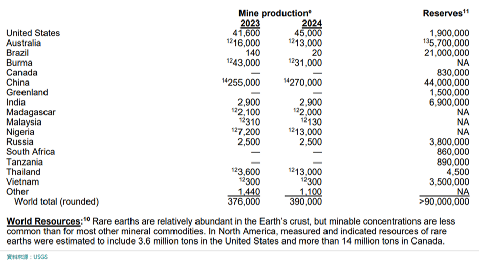 2024年中國稀土礦產量約27萬噸,較2023年的25.5萬噸增加 5.9%,占全球39萬噸總產量的69.2%,是世界第一大稀土礦生產國;美國2024年產量約4.5萬噸,較2023年的4.16萬噸增加8.2%,占全球11.5%。兩相對比,中國當年產量約為美國的六倍,且其資源儲量亦明顯領先——中國約4,400萬噸,美國僅約190萬噸。