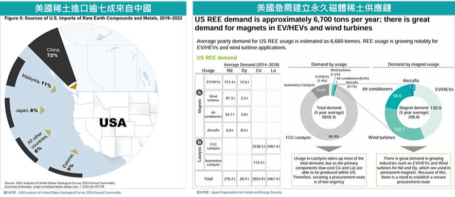 美國年均稀土需求約6,700 噸:其中FCC、車用觸媒等以鈰、鑭為主的低價位氧化物占逾九成,替代性較高、短期供應急迫性較低。相對地,磁體用稀土用量雖較小,卻直接影響產業升級、能源轉型以及國防科技的關鍵;也因此,美國須建立安全且穩定的採購管道,如多元來源、長約/包銷、回收循環與庫存機制,才能確保磁體用稀土不因供應中斷而受影響。