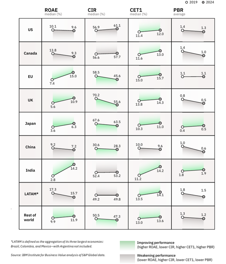 就近年數據與制度動能來看,美國銀行展現出資本厚實、獲利範圍更廣的優勢。IBM Institute for Business Value〈2025 Global Outlook for Banking and Financial Markets〉報告提到,美國銀行資本韌性持續增強,其普通股權益第一類資本比率(CET1)自2019年的11.4%提升至2024年的12.0%,處於全球金融危機後的高檔水準,為後續放款與投資布局提供更大安全邊際與成長彈性。