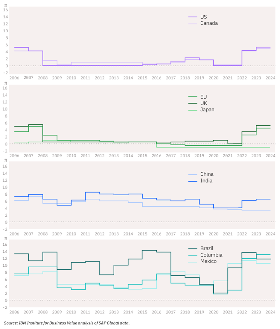 中國與印度的政策利率相對平穩,印度自2022年起小幅上調利率並維持高於中國水準,反映其經濟成長與通膨動能較強。拉丁美洲則長期維持高利率結構,2021年後更進入新一輪升息周期,銀行業的利差收入高於全球平均。
