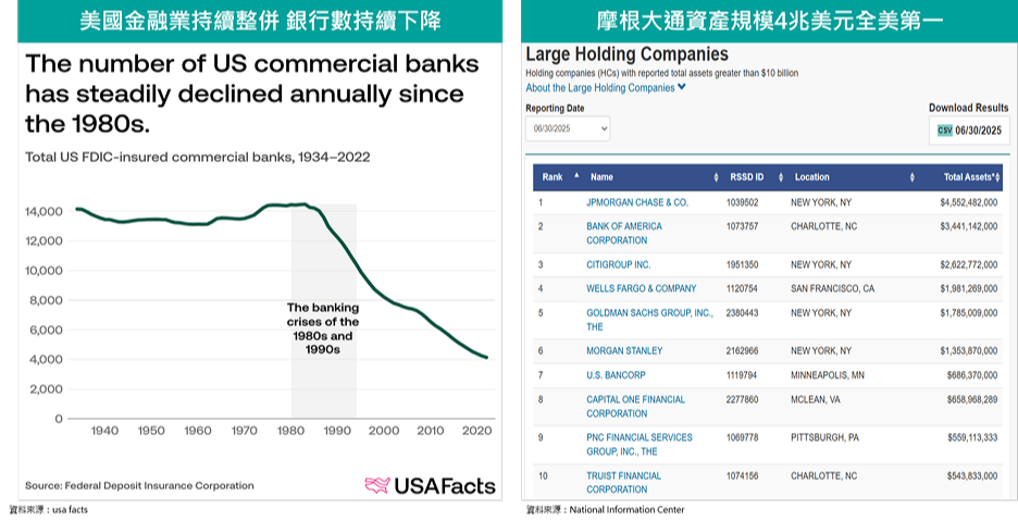 自此,美國銀行體系在數十年間從分散走向集中,根據資產規模排名,目前美國前十大規模的銀行(金融控股公司)排名分別為:摩根大通、美國銀行、花旗集團、富國銀行、高盛、摩根士丹利、美國合眾銀行、第一資本金融、PNC金融服務集團及TRUIST金融公司。美國前五大銀行合計擁有全美銀行業資產的71%,相較之下,歐盟僅約52%。這些巨型銀行不僅主導國內信貸與存放款市場,也深度參與全球資本與衍生性金融市場,反映出美國金融業由少數大型銀行集團壟斷、規模經濟驅動的結構。