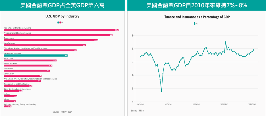 根據美國聖路易聯準銀行(FRED)與美國經濟分析局(BEA)資料,美國金融業在整體經濟中長期佔據舉足輕重的地位。2024年,美國「金融與保險業」貢獻國內生產毛額(GDP)7.6%,在所有產業中排名第六位,若加計房地產與租賃活動(13.6%),整個「金融與房地產體系」合計占比達 21.2%,居美國最大產業。美國經濟深度依賴資本市場的資金配置、信貸擴張與風險管理機能,金融業不僅僅只是經濟的服務部門,更是推動企業成長與家庭財富累積的核心引擎。