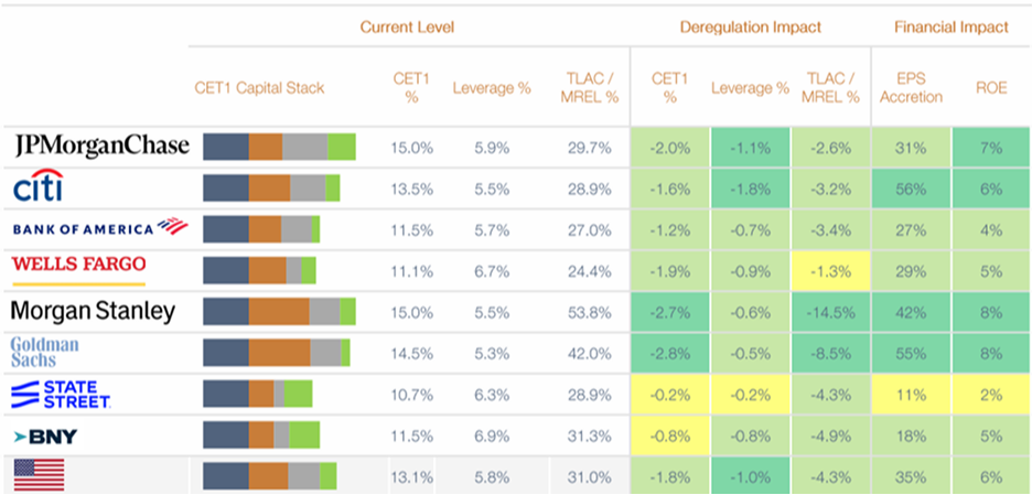 在財務層面上,A&M模型預估此舉可讓美國銀行平均每股盈餘(EPS)成長35%、股東權益報酬率(ROE)提升6個百分點。其中,花旗、高盛與摩根士丹利受益最明顯,ROE提升約6~8個百分點。