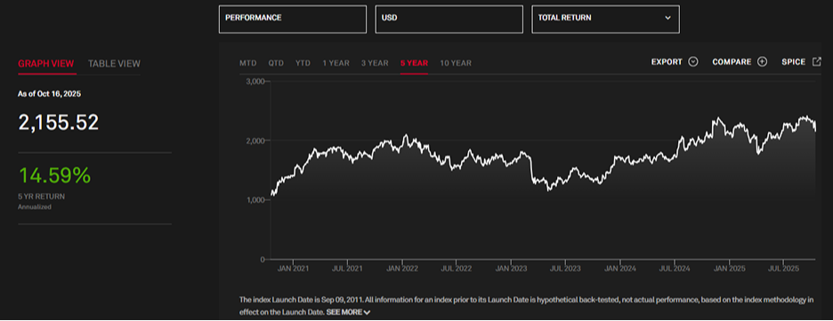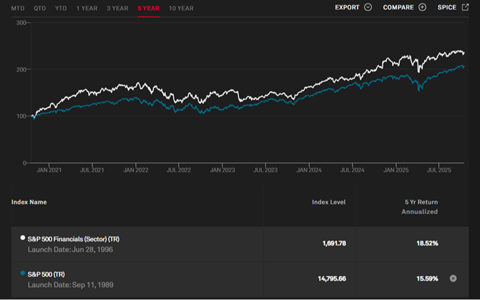 在美國金融股中,銀行股是主要的組成。以S&P Banks Select Industry指數來看,過去五年年化含息報酬率達14.59%。自2024年起,淨利差改善以及股東回饋增加效益發酵,指數重回成長軌道並在2025年再度創波段高。