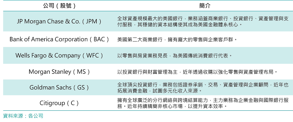 JP Morgan、Bank of America、Wells Fargo等屬於傳統大行,Goldman Sachs、Morgan Stanley代表投資銀行與資產管理業務的高端領域;Citigroup則以國際金融與跨境結算為強項。這些機構的共同特徵是資產規模龐大、業務版圖跨國、且與經濟循環密切連動,能在升息環境下受惠於利差擴大,也另能透過財富管理與資本市場業務維持長期穩定獲利。綜觀來看,它們象徵美國金融業的多元結構與全球影響力,是美國股市的主要金融權值股。