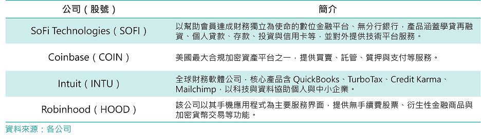 除了那些耳熟能詳的銀行巨頭外,美國市場近年也湧現出一批以科技驅動金融創新的FinTech(金融科技)企業,正快速改寫金融服務的版圖。SoFi以一站式數位金融切入,從學貸再融資擴展到個人貸款、存款、投資與信用卡,並對外提供技術平台服務;Coinbase是美國最大的合規加密資產平台之一,提供買賣、託管、質押與支付等基礎設施;Intuit以消費者稅務軟體、個人理財軟體等產品串起個人與中小企業的財務;Robinhood採用零手續費以及遊戲化的交易體驗崛起,近年更進一步觸及加密資產。這些公司透過數位支付、線上貸款、軟體訂閱與加密基建等模式提升效率、降低成本,挑戰傳統金融業的效率與成本結構,也逐步成為推動美國金融體系創新的新引擎。