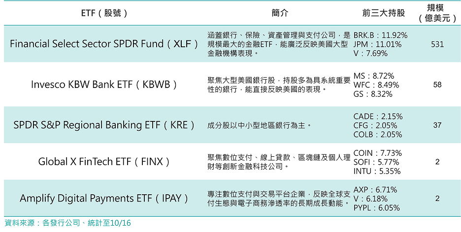 若投資人欲布局美國銀行股,不一定要單押個別公司,也能透過ETF達到分散投資與主題聚焦的效果。以 Financial Select Sector SPDR Fund(XLF)為例,它涵蓋銀行、保險與支付公司,是美國金融領域中規模最大的ETF,能全面反映大型金融機構的整體表現。若希望聚焦銀行板塊,可選擇集中於摩根士丹利、富國銀行、高盛等大型銀行的Invesco KBW Bank ETF(KBWB),或是以地方型銀行為主的SPDR S&P Regional Banking ETF(KRE)。另一方面,對金融科技題材有興趣的投資人,可考慮Global X FinTech ETF(FINX),其聚焦數位支付、線上借貸、區塊鏈與自動化理財等創新企業;或選擇Amplify Digital Payments ETF(IPAY),專注全球支付生態。