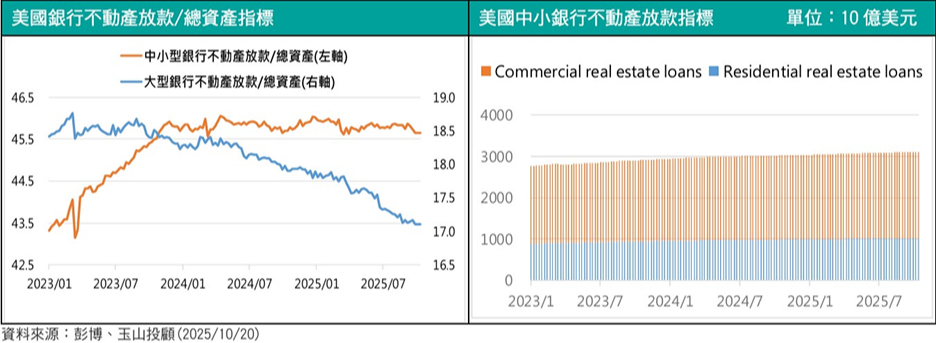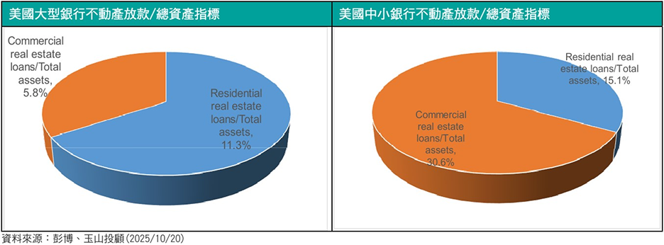 截至2025年10月,美國商業銀行對商業不動產(CRE)放款規模約3兆美元,占總放款比重約12.4%:顯示該領域對金融體系的重要性仍高。值得注意的是,中小型銀行對商業不動產曝險顯著高於大型銀行,放款比重達30.6%,是大型銀行的五倍以上。這意味著,一旦商業不動產市場出現系統性風險,衝擊最先、也最深的將是中小型銀行體系。相較之下,大型銀行雖資產規模龐大,但其不動產曝險比重較低且分散度高,具較強緩衝能力。因此,美國銀行體系的潛在脆弱點集中在中小型銀行對商用不動產的高度集中放款,一旦商用不動產價格下跌或借款違約上升,將可能引發區域性流動性與信貸風險,對整體金融穩定構成壓力。