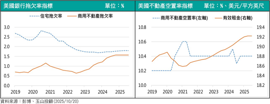 一、商用不動產(包括辦公、零售、工業等)放款拖欠率需要關注,從2022年9月的0.63%低點急遽攀升至2025年6月的1.57%,短短不到三年增長超過1.5倍。相較之下,住宅放款拖欠率從疫情高峰的2.83%改善至1.79%,表現相對穩健。
