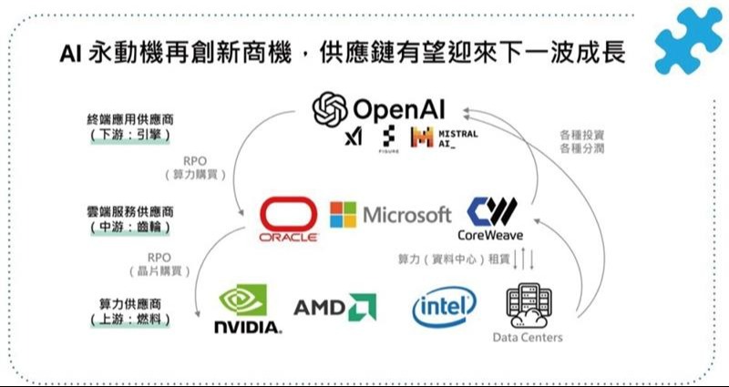 當前市場形成獨特資金閉環:終端應用供應商(如Open AI)向雲端服務商(如Oracle)採購算力,雲端服務商再向晶片供應商(如NVIDIA)購買高效能晶片,構成AI生態系「永動機」商機。台積電作為NVIDIA核心晶圓代工夥伴,其CoWoS先進封裝技術獨家支援NVIDIA高效能晶片,成為市場焦點。台積電2025年第3季財報顯示,營收達9,899億元新台幣,季增6%,年增30%,每股盈餘(EPS)17.44元,創歷史新高。法說會中更強調,AI算力需求超乎預期,客戶訂單激增,推升股價於2025年10月20日再創新高,AI永動機概念股持續受市場關注。