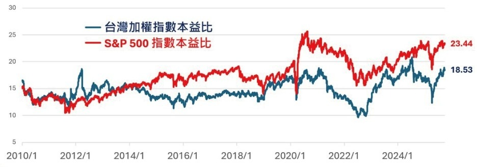 全球經濟自歐債危機後逐步復甦,台股與美股本益比平均為15倍,但台股估值相對低檔。隨著AI驅動的智慧手機與雲端應用快速發展,NVIDIA、Google等美國科技巨頭帶動美股評價上修,台股在AI供應鏈的關鍵角色下,估值有望跟進成長,詳細參考下圖。