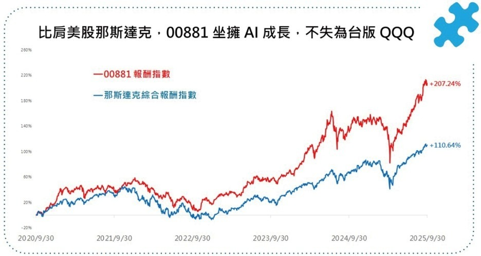 與美國Invesco QQQ Trust(QQQ)追蹤那斯達克100指數(聚焦科技與創新型企業)相比,00881的選股方向高度契合,涵蓋半導體、IC設計、散熱與ODM等AI核心產業,提供投資人參與全球AI浪潮的便捷管道。此外,00881於2025年9月12日在日本掛牌,成為首檔台日跨境ETF。台積電在熊本設廠的成功,吸引日本機構與投資人關注台灣科技股的長期價值,進一步提升00881的投資價值。