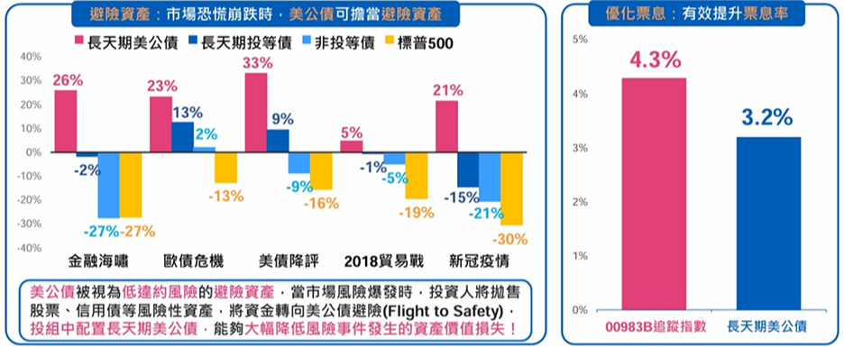 作為一檔保守債息避險資產的代表,大華優利美公債20(00983B)在過往高風險黑天鵝出現時,表現相對出色。2008年金融海嘯長天期美公債上漲26%,新冠疫情期間上漲21%,有別於標普500分別下跌27%與30%來看,00983B確實擁有良好黑天鵝事件避險能力。同時也優化票息設計,進一步提升收益潛力,並重點放在長天期債券(債券距到期日須≧20年)等待資本利得。
