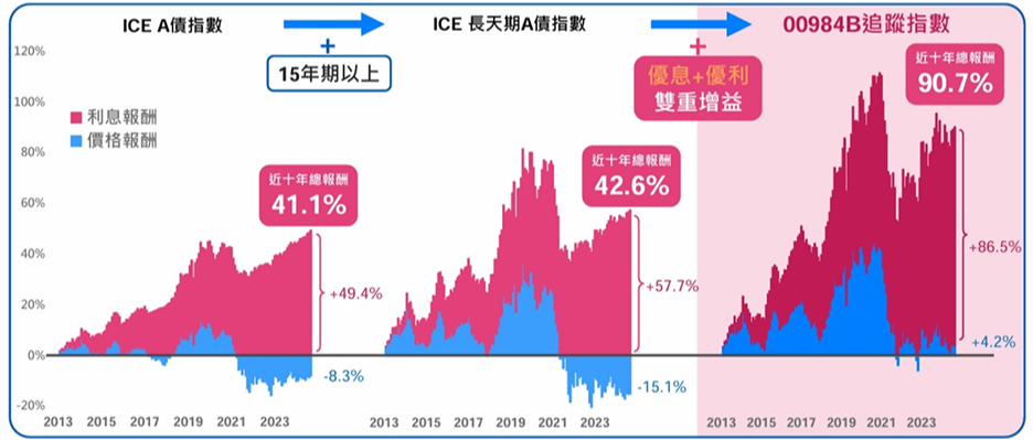 大華優麗美A債15(00984B)篩選高票息(前20%)+高殖利率債券,收息穩定與價格報酬,近10年總報酬來到90.7%,優於ICE A債指數,及ICE長天期A債指數,且前十大發行人均為產業龍頭,涵蓋醫療、產業保險、媒體、公共事業等,多為G10已開發國家的優質企業,且單檔債券流通在外金額須≧5億美元,流動性佳。信評機構給予債券的平等須在A-以上,且指納入債券池中票面利率排名前20%的債券,再進一步優化成分債券權重配置,逢低加碼提升投資組合殖利率,達到「優息+優利」效果。