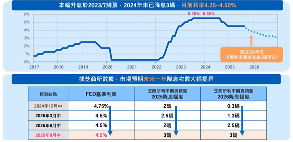 美國聯準會從2023年7月升息觸頂後,再2024年降息3碼,根據芝商所利率期貨數據,預計2026年底降息幅度將達到6碼,近期通膨趨於穩定。受到近期美國政府關門影響,9月非農報告尚未公布,但ADP民間就業報告顯示,9月民間就業減少3.2萬人,創二年半最大減幅,勞動市場壓力大,降息預期升溫,似乎已成定局,這些因素都創造了長天期債券投資的黃金時機。