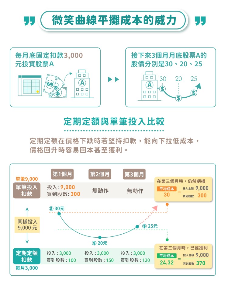 而這正是「定期定額」存在的意義。當你設定固定金額自動扣款時,不論市場漲跌都能分批買入:買貴、買便宜平均攤平,讓進場成本更平滑、風險更低。更重要的是,理財從來不是有錢再做,而是做了才會有錢。只要開始行動,透過資本利得與股息再投入的複利滾動,時間會成為你最強的助力。