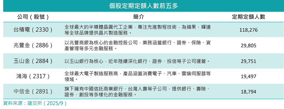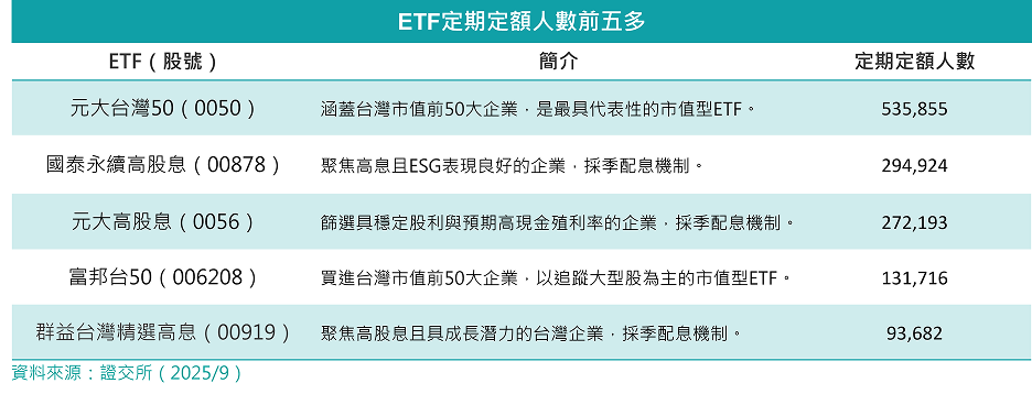 不妨先從元大台灣50(0050)、富邦台50(006208)等市值型ETF開始看起。這類ETF集合了台灣市值最大的龍頭企業,等於一次投資整個台股代表隊,不需要自己選股,只要定期定額、長期持有,就能搭上台股市場成長帶來的報酬,是許多投資人最穩健的入門選擇。