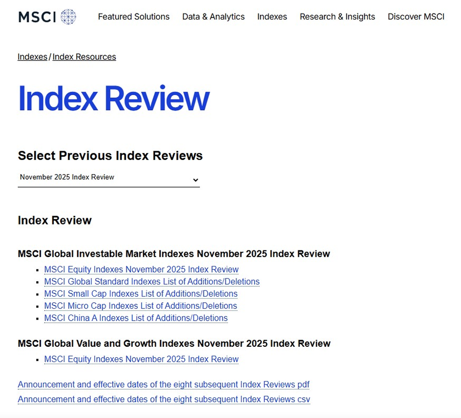 MSCI會定期進行成分股審核,並於官網提前公布最新結果與生效日期。當指數於生效日正式調整時,因被動型基金需同步調整持股,多會使市場成交量在生效日時大增。