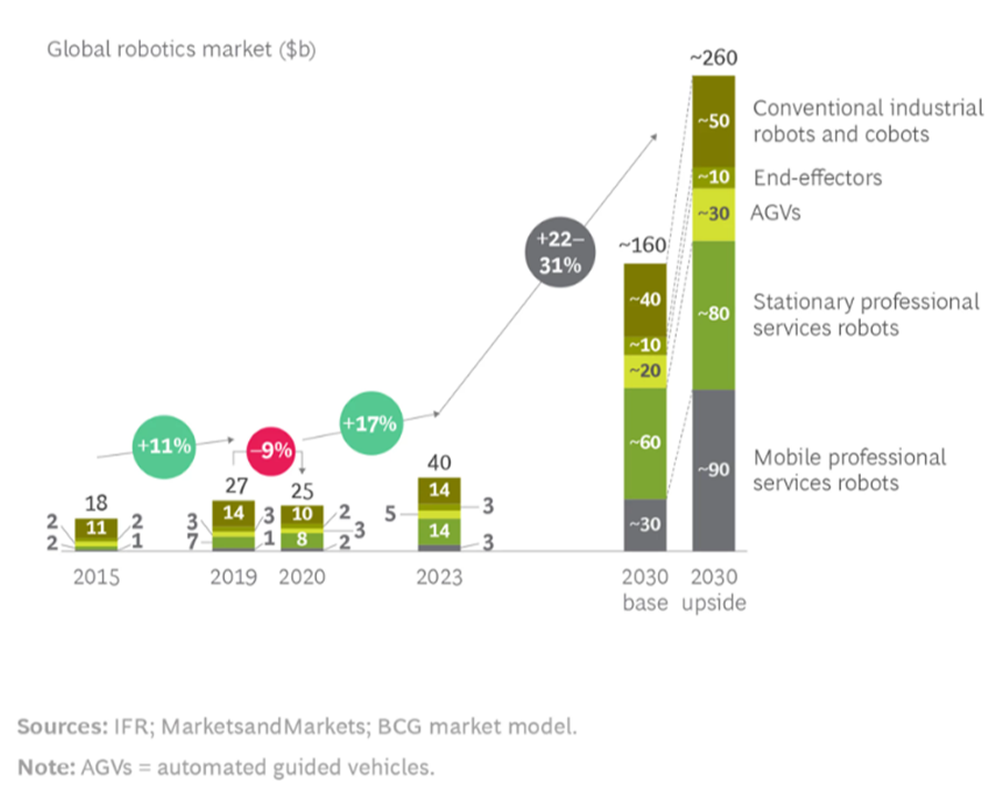 波士頓諮詢公司(Boston Consulting Group, BCG)的預測進一步凸顯了這項結構性轉變:到 2030 年,全球機器人市場規模可望從目前約250億美元,快速擴大至1,600億至2,600億美元,而其中增長主力將來自「專業服務型機器人」。