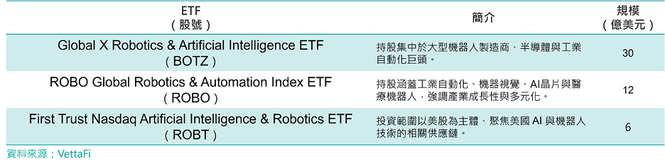 若投資人希望以更分散且系統化的方式布局機器人產業,市場上也有多檔專注於機器人與自動化主題的ETF。例如,Global X Robotics & Artificial Intelligence ETF(BOTZ)是最具代表性的機器人ETF之一,規模最大,持股集中於全球大型機器人製造商、半導體與工業自動化巨頭。與之近似的另一檔則是ROBO Global Robotics & Automation Index ETF(ROBO),持股涵蓋全球工業自動化、機器視覺、AI晶片與醫療機器人,成分股產業多元化。而First Trust Nasdaq Artificial Intelligence & Robotics ETF(ROBT)是以美股為主體、聚焦美國AI與機器人技術相關供應鏈。