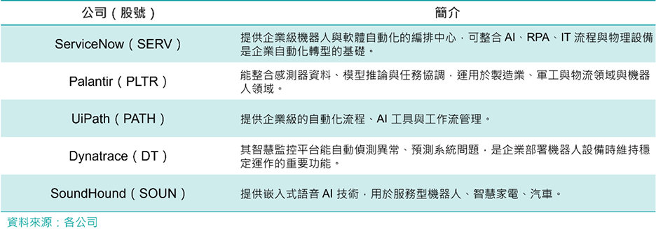 另一方面,隨著機器人走向自主決策、自主導航與人機互動,軟體與AI是決定機器人智慧化程度的關鍵環節。從ServiceNow的自動化平台、Palantir的數據整合,到SoundHound的語音互動技術,提供讓機器人能思考、能協作、能與人溝通的能力。
