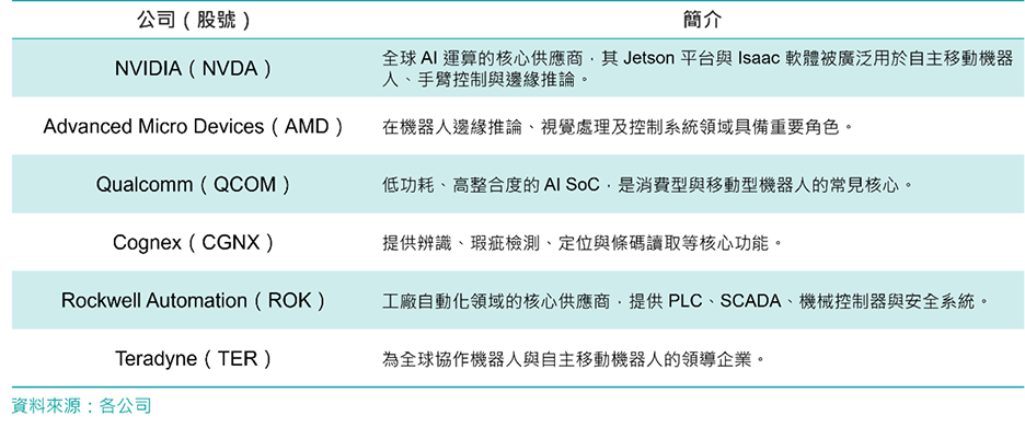 無論是工業機器手臂、倉儲自動化設備,或近年備受關注的人形機器人,所有機器人都仰賴一條共同的硬體供應鏈。這條供應鏈涵蓋高效能運算晶片、影像與感測模組、動作控制系統、以及工業自動化設備。這些涵蓋NVIDIA的AI運算平台、Cognex的機器視覺、Qualcomm的低功耗SoC、Rockwell的自動化產品、以及Teradyne的協作機器人系統等。