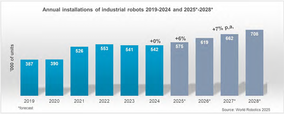 全球機器人市場在過去十年中展現出顯著的成長。在工業機器人方面,受製造業自動化需求的驅動,全球年安裝量已連續多年突破50萬台大關,使得全球工廠中運行的機器人總數超過466萬台。其中,汽車產業是工業機器人應用的最大場域,但電子電機、金屬製造等通用製造業的採用率迅猛提升,反映出自動化正向更廣泛的產業鏈滲透。