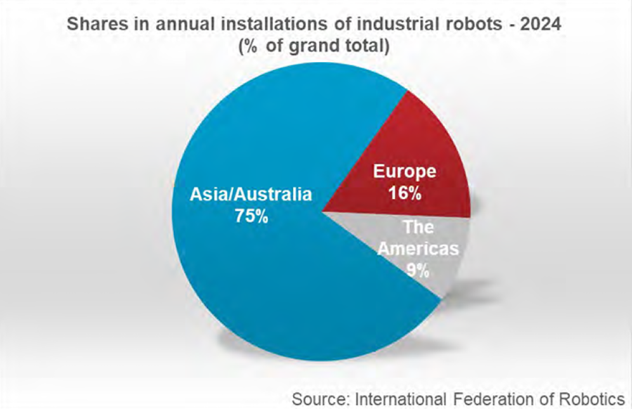 在地域分布上,全球機器人產業呈現出明顯的「亞洲主導」格局。亞洲市場的機器人部署量佔據全球主導地位,其中中國憑藉其作為全球製造中心的地位和國家政策的大力推動,成為全球最大的機器人應用市場,年安裝量占比超過全球總量的一半。日本和韓國也因其高度自動化的製造業基礎,分別位居市場前列。