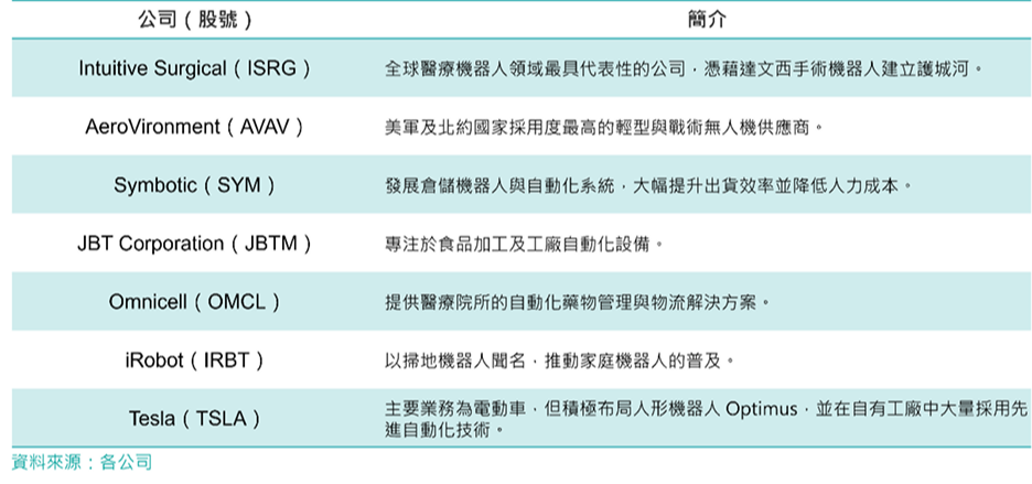 機器人本體製造商涵蓋醫療手術機器人、倉儲自動化系統、軍用自主無人機、家庭清潔機器人到協作型機器手臂等應用。這些公司代表機器人市場前端需求,其成長動能來自醫療人力不足、物流自動化、國防無人化與家庭服務型產品普及。值得注意的是,以Tesla為代表的科技公司正將大量資源投入人形機器人(Humanoid Robots)的研發,這項通用型機器人被視為對未來工業和服務市場最具顛覆性的技術。
