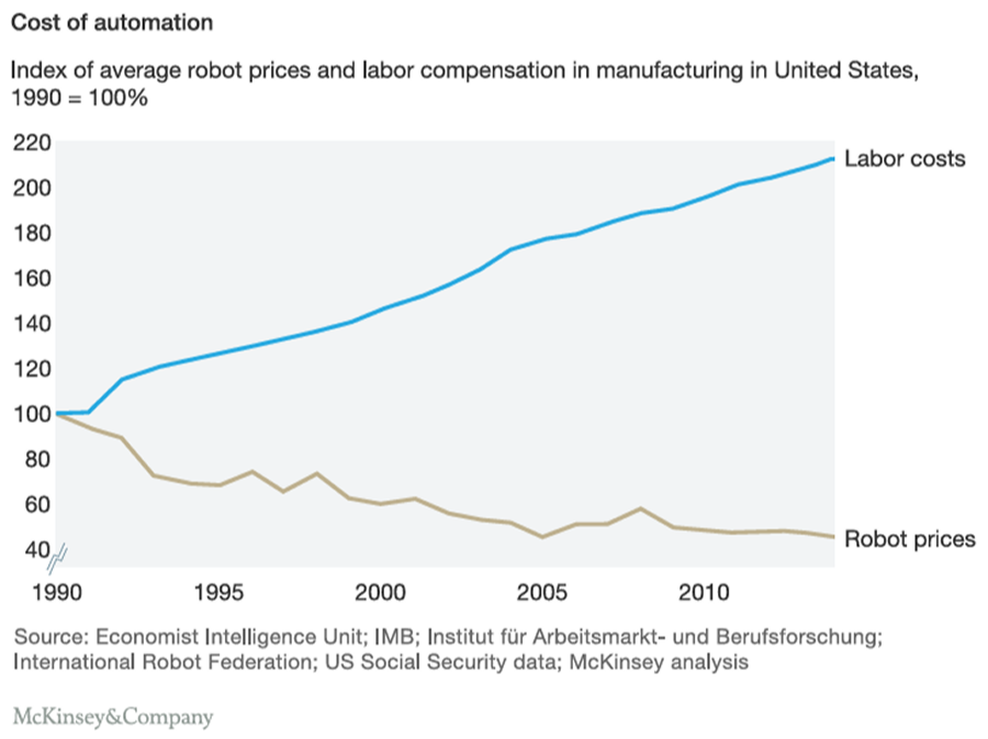 除此之外,自動化設備愈來愈便宜,而人工成本卻持續攀升。以美國為例,就美國製造業中勞動報酬(Labor costs)與機器人平均價格(Robot prices)的動態對比,以1990年作為100%的基準,製造業的勞動報酬持續且顯著地上升,指數最終達到約220%,表明人力成本在二十年間翻了一倍多。相較之下,機器人平均價格持續下降,穩定在40% ~60%區間。兩者的差距強烈地展現了自動化的成本優勢。對企業而言,部署機器人的成本效益正快速提升,不僅能以更大規模導入自動化設備,也能讓機器人涵蓋更多不同的製造情境,使自動化在經濟上變得更具優勢。