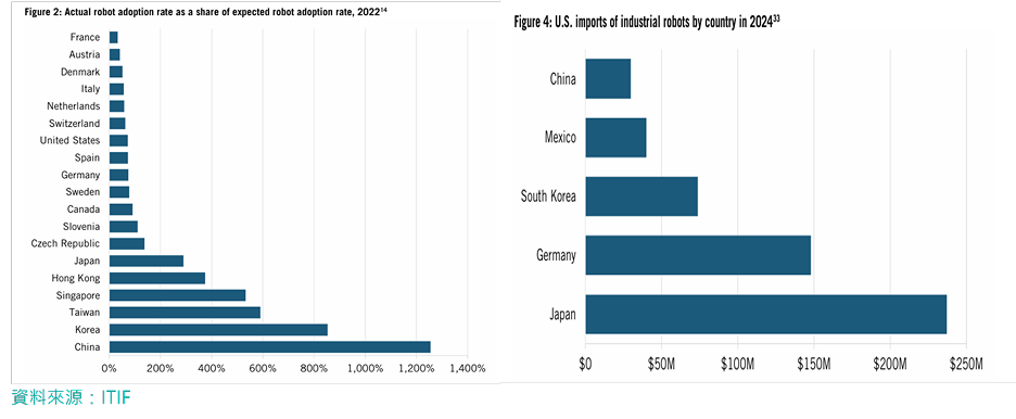 與亞洲國家相比,美國自動化採用率明顯偏低。根據美國智庫 ITIF(Information Technology & Innovation Foundation)的報告《A Time to Act: Policies to Strengthen the US Robotics Industry》指出,依照工資與產業結構推算,美國本應部署更多機器人,但實際採用率僅達預期的70%,排名第 13;反之,中國、南韓、台灣等東亞國家採用量遠超預期,其中中國更高達12.5倍,凸顯全球自動化競爭中,美國正面臨明顯落後風險。