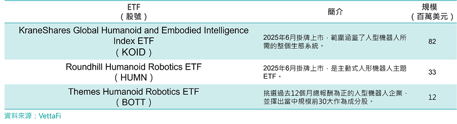 如不想押單一公司,買進主題型ETF是較常見且入手門檻相對友善的方式。KraneShares Global Humanoid and Embodied Intelligence Index ETF(KOID)是以人型機器人為主題的ETF,成分涵蓋機器人本體、AI技術到重要零組件。與之相似的還有Themes Humanoid Robotics ETF(BOTT),惟其選股方式是從全球挑選與人型機器人相關、且近一年表現不錯的企業,組成較均衡的供應鏈組合。而Roundhill Humanoid Robotics ETF(HUMN)則採主動式管理。