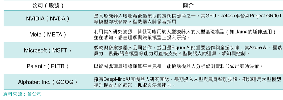 人型機器人的發展除了仰賴本體製造商的突破,也需要龐大而成熟的零組件供應鏈支撐。從運算晶片、感測元件、馬達與致動器,到工控系統、工業級連接器與高精度傳動模組,這些關鍵零組件共同構成人形機器人的「骨骼、肌肉與神經系統」。隨著人形機器人朝商業化邁進,相關供應鏈的重要性日益提升,不僅支援機器人的動作控制與感知能力,也將左右未來量產的可行性與成本結構。