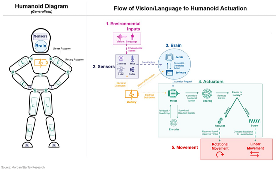 人型機器人是由五大模組組成:外在資訊(Inputs)→感知(Sensors)→ 理解(Brain)→ 動作執行(Actuators)→ 動作表現(Movement)。