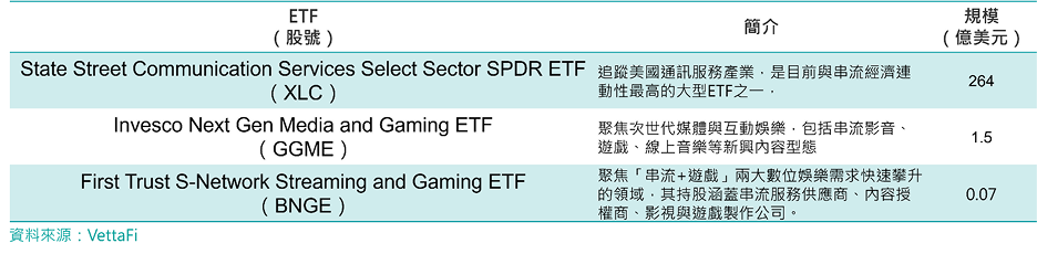 串流經濟橫跨平台、內容製作、通訊基礎建設、廣告技術與雲端服務等多個面向,因此,投資布局串流生態系時,多往往會透過資訊科技類型的產業ETF來切入,儘管如此,市場上仍有部分規模較小的串流經濟主題型ETF,專注於串流、媒體或互動娛樂等細分領域,提供投資人更聚焦的選擇。