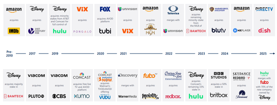 面對高流失率帶來的成長瓶頸,各大串流平台除了調整內容節奏、導入廣告方案外,隨著內容成本高漲、用戶黏著度下降,併購也成為平台提升內容厚度、串接生態系並擴大談判能力的關鍵手段。自2017年迪士尼併購21世紀福斯開始,科技巨頭、傳統媒體與新興串流平台開啟了大併購時代,併購頻率和規模皆有增無減。