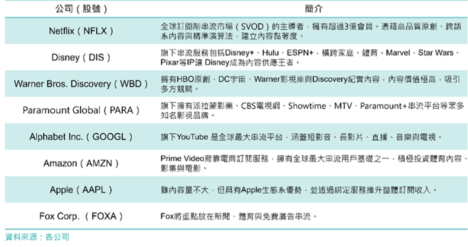 下列表中整理出美國串流經濟的主要代表性企業,分別展現出串流市場不同面向的競爭優勢。整體而言,可分為三大類型:以訂閱制串流為核心的平台、以高價值內容資產為主的內容供應者,以及依靠生態系與跨服務整合驅動串流成長的科技公司。