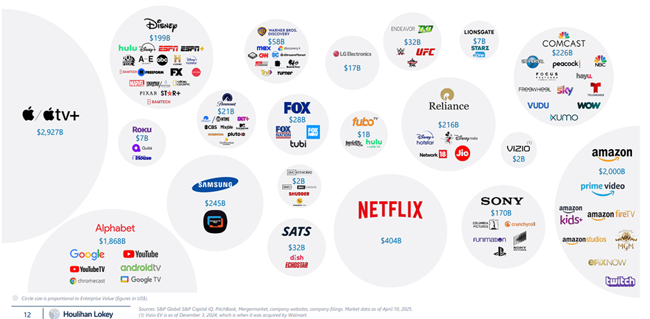 Apple、Alphabet、Amazon等科技巨頭,憑藉硬體生態系、作業系統與雲端服務,掌握了串流平台、分發渠道與裝置端的控制權。各擁有Apple TV+、YouTube、Prime Video,與智慧型手機、智慧電視與語音裝置緊密整合。